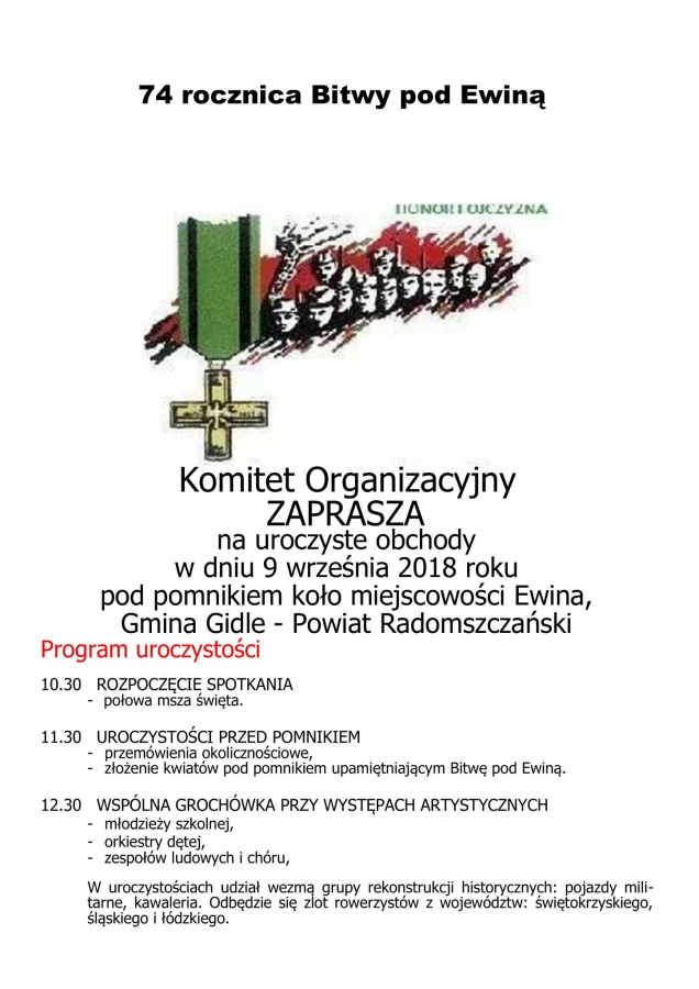 Sojusz Lewicy Demokratycznej w Radomsku, z przewodniczącym Arkadiuszem Ciachem na czele, zaprasza na uroczyste obchody 74. bitwy pod Ewiną, które jak co roku obędą się w gminie Gidle nieopodal Ewiny.